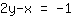 Also ich hab hier die Aufgabe 2y-x=-1 aber was ist x wenn nichts davor steht ich hab zwar bis jetzt in etwa geschaft herauszufinden wie man das rechnet aber ich hab keine Ahnung was x ist. Währe toll wenn mir jemand das beantworten könnte! Danke schon mal im voraus! |