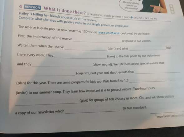 - Englischaufgaben/ passiv , activeda heißt es : Write down what is usually done und what is being done today by Mrs. Davenport and her colleague. Mrs. Fisher..
