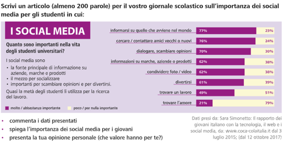 Hallo liebe Menschen hier, könnt ihr bitte mein Text korrigieren bitte, Bitte Grammatik bitte dringend (alles LIEB gemeint liebe leute :)).......? Mein Text: Oggi descrivo il grafico "I SOCIAL MEDIA", che è di Sara Simonetto ed è stato pubblicato nel luglio 2005. Il grafico è un diagramma a barre e ha il titolo "Quanto sono importanti nella vita degli studenti universitari? Inoltre, le battute consistono in una parte molto/abbastanza importante e poco/per nulla importante. I social media sono molto importanti per i giovani d`oggi, perché chattando con i loro amici, parlano al telefono e controllano le notizie quotidianamente. Poi, pubblicano foto e video ogni giorno e conoscono le persone. Secondo me, i social media creano dipendenza nei giovani. Puoi fare nuovi contatti e tutti sanno tutto di te. A me sembra che i bambini e i giovani possono cadere nei truffatori ed essere molestati sessualmente. Ulteriore usano meno i social media per lavorare e leggere le notizie. Dopo molti giovani odiano e insultano gli altri a causa del corpo. Grafik: ![]() Bitte hilft mir liebe leute, es ist sehr wichtig bitteeee.............? Frage bearbeiten |